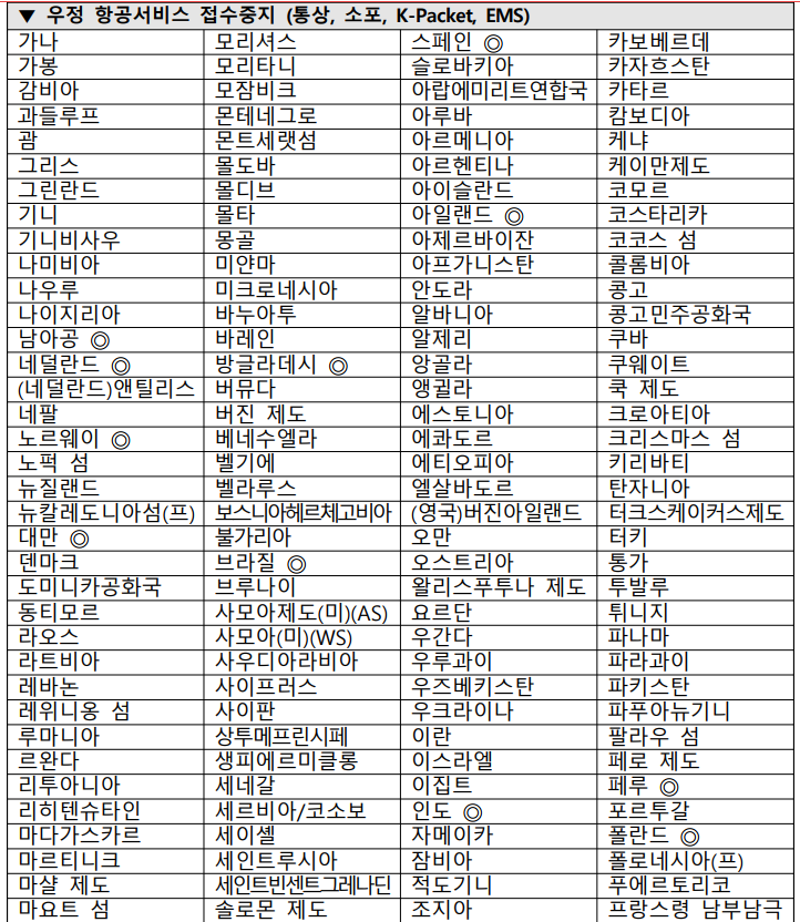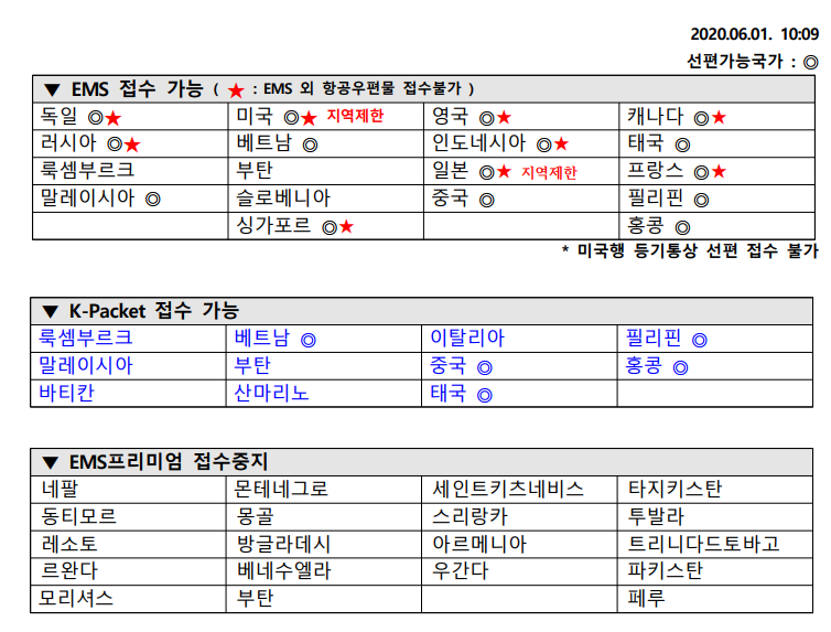 [우체국인용공지] 2020년 6월 1일 현재 국제배송현황안내