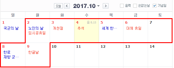 * 연휴기간 : 2017년 10월 2일 (월) ~ 9일 (월)