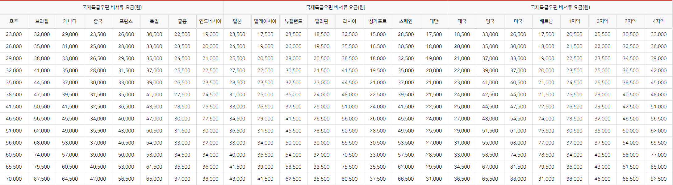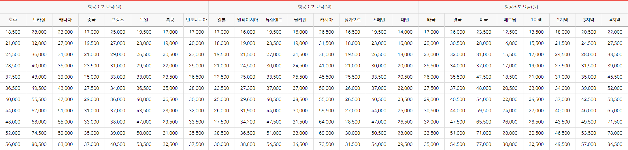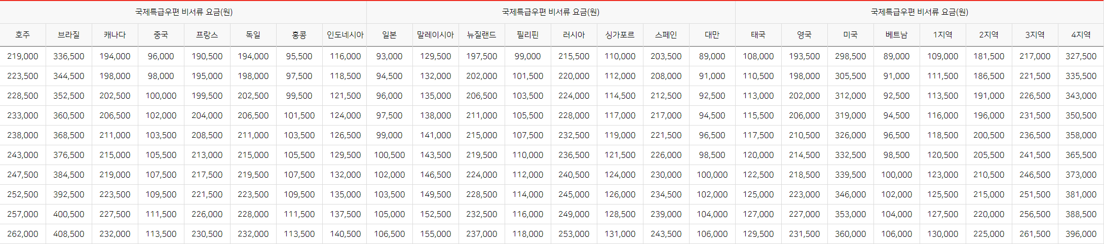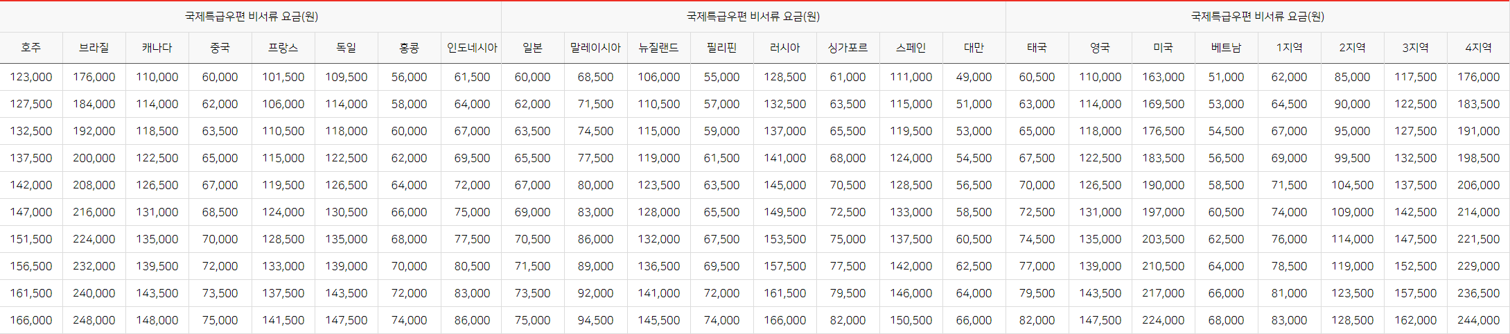 * 1지역, 2지역, 3지역, 4지역별 나라는 여기 를 눌러 확인하세요.