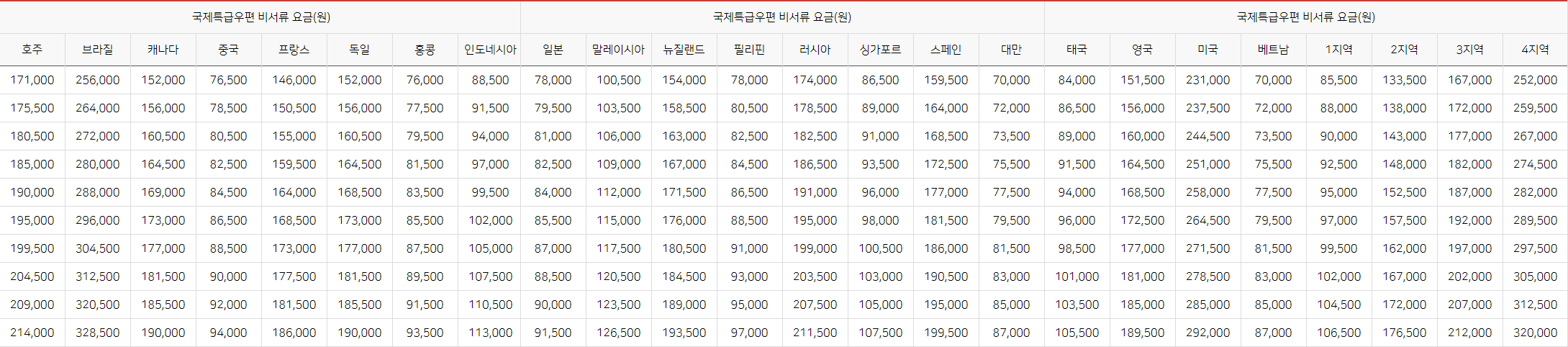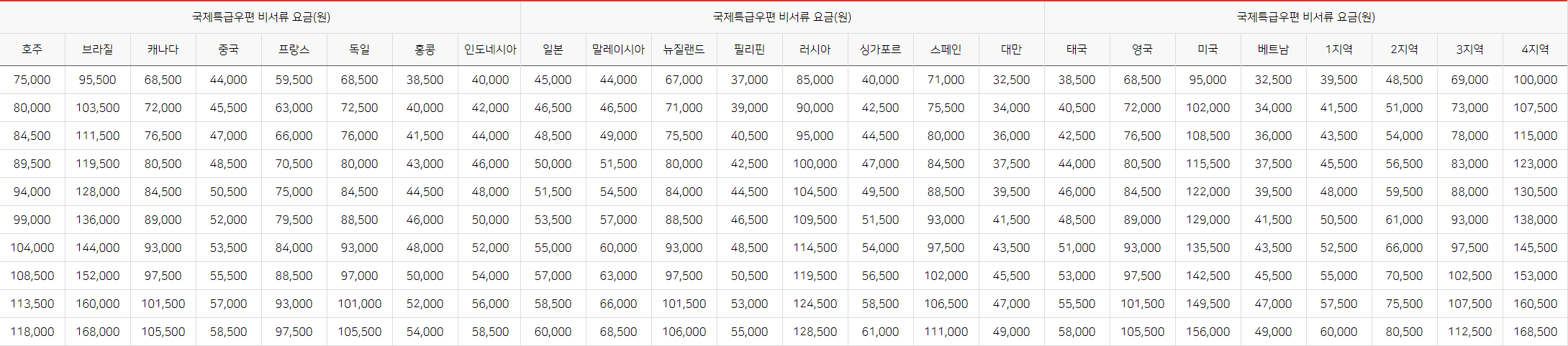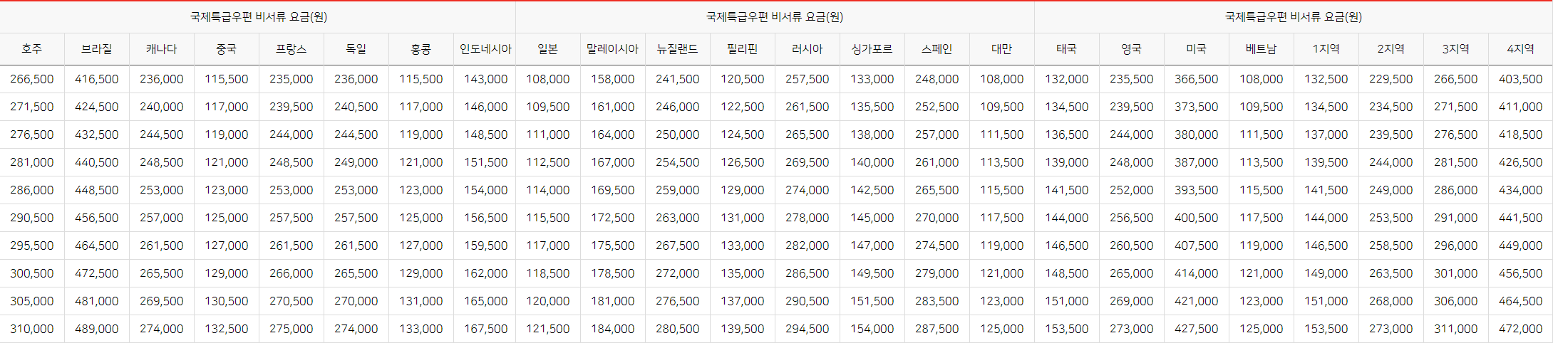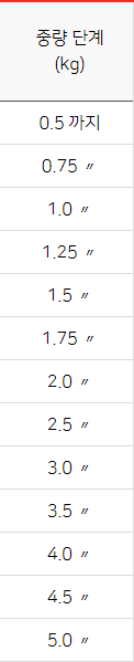 * 우체국에서 제공하는 국세소포(CP) 요금표는 여기 를 눌러보세요.